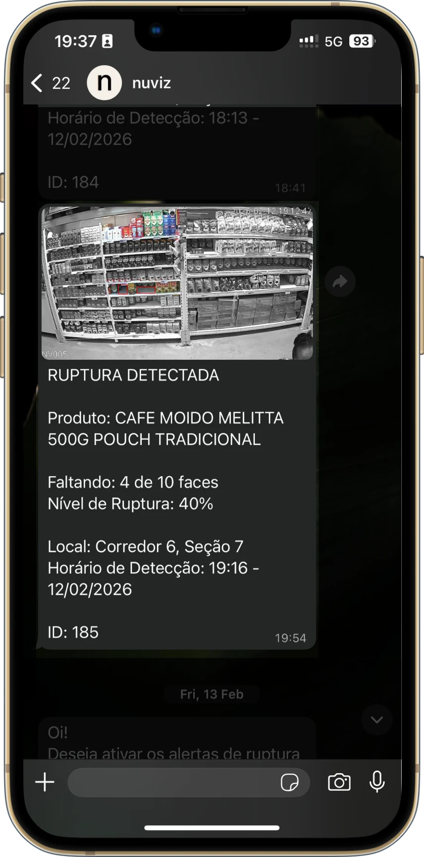 O responsável recebe o alerta no WhatsApp, com foto e localização exata. A Nuviz elimina o único obstáculo para a reposição: não saber.